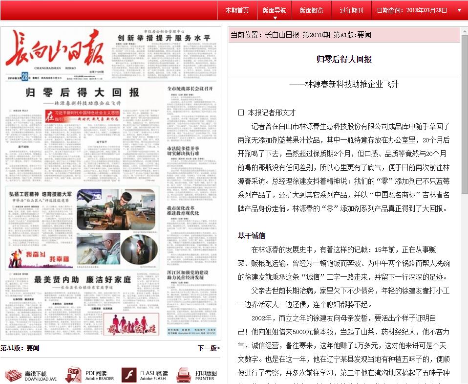 【概要描述】歸零后得大回報(bào) ——林源春新科技助推企業(yè)飛升 □本報(bào)記者邢文才 記者曾在白山市林源春生態(tài)科技股份有限公司成品庫(kù)中隨手拿回了兩瓶無添加劑藍(lán)莓果汁飲品,其中一瓶特意存放在辦公室里,20個(gè)月后開瓶喝了下去,雖然超過保質(zhì)期2個(gè)月,但口感、品質(zhì)等竟然與20個(gè)月前喝的那瓶沒有任何差別,所以心里更有了底氣,便于日前再次前往林源春采訪。總經(jīng)理徐建友抖著精神說:我們的“零”添加劑已不只藍(lán)莓系列產(chǎn)品了,還擴(kuò)大到